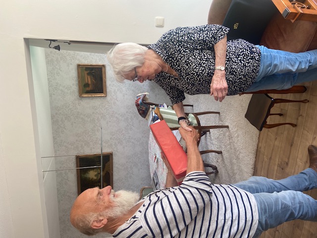 Het meegenomen gebak smaakte de jubilaris prima bij de koffie, de prachtige bloemen werden ook zeer gewaardeerd.