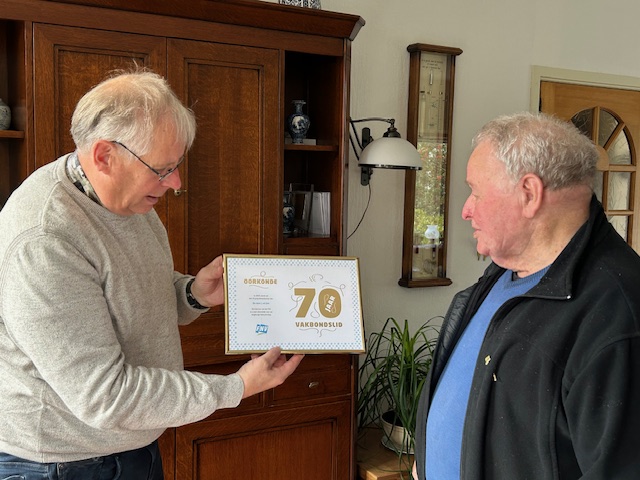van der Zee werd gefeliciteerd met het 70 jarige lidmaatschap van de FNV, dit heugelijke feit kon hij samen vieren met zijn zoon en dochter.