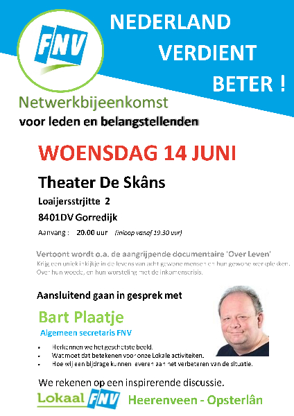 14 Juni komt Bart Plaatje algemeen secretaris FNV naar Gorredijk.