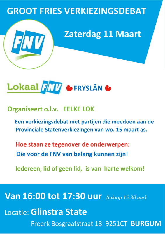 De gezamenlijke lokale netwerken van de FNV in Fryslan organiseren met het oog op de aanstaande Provinciale Statenverkiezingen een verkiezingsdebat met vertegenwoordigers van partijen die mee doen aan die verkiezingen op